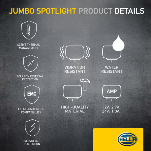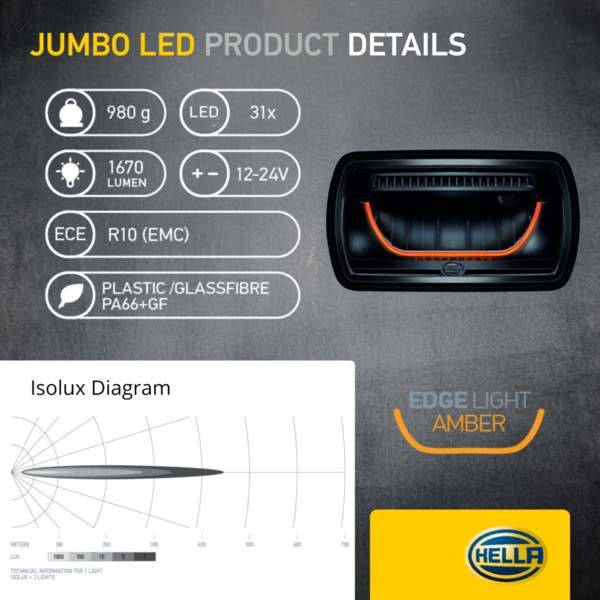 State-of-the-art LED technology. HELLA’s Iconic Jumbo lamp, went full LED in 2020 -one of the first to feature cutting-edge LED Technology. Now in 2026, it gets even better with the Amber smile.